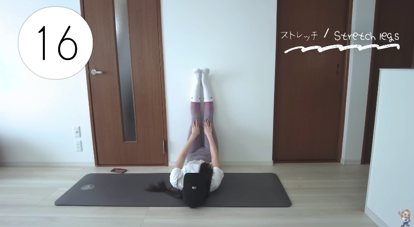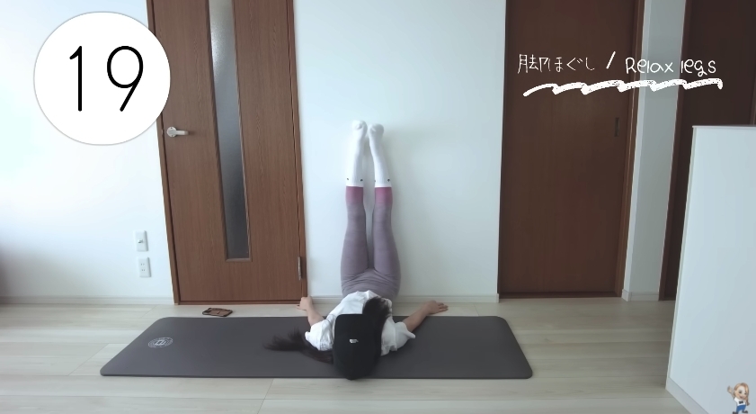 第一個動作先平躺在瑜伽墊上,然後將雙腿抬起並貼實牆壁,下半身呈90度,之後可以輕輕擺動雙腿,又可以輕輕拍打大腿,放鬆一下腿部肌肉,為接下來的動作做好準備。