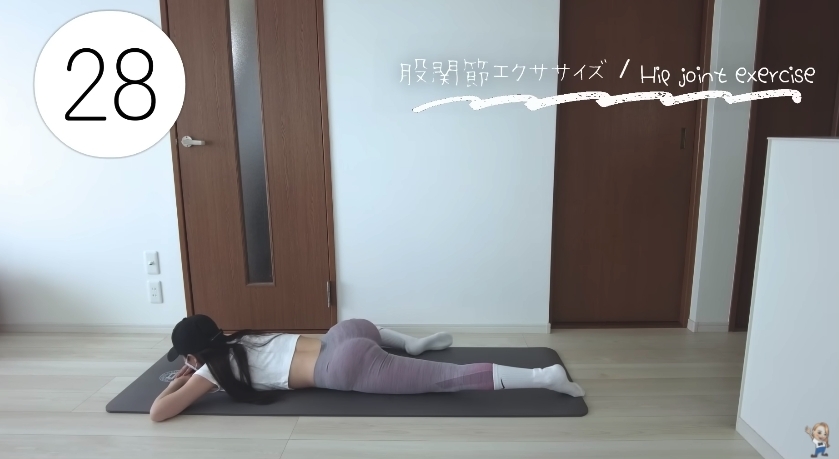 第六個動作是針對髖關節,先俯臥在瑜伽墊上,然後將其中一隻腳向旁伸展,每邊腳輪流做30秒。