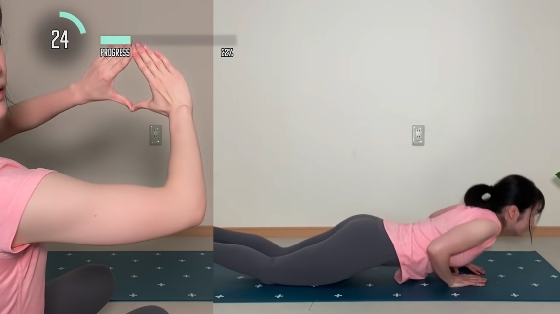 之後可以延續上一個動作並將膝頭輕輕跪下,兩隻手掌要呈菱形,之後就可以開始做掌上壓,記得將雙手向內,就可以用到更多胸部的力量。