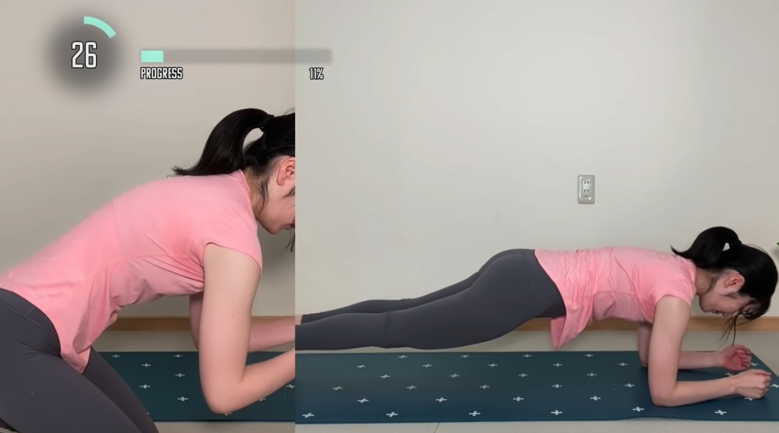 大家先在瑜珈墊上做出平板動作,可以稍微抬起背部,令到兩邊胸部集中在一起。