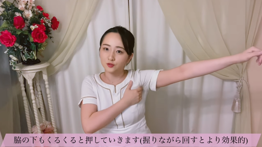 第二個動作先輕輕抬起單邊手臂,然後用4隻手指打圈按壓腋下位置,做完一邊就做另一隻手,可以促進淋巴的血液循環。