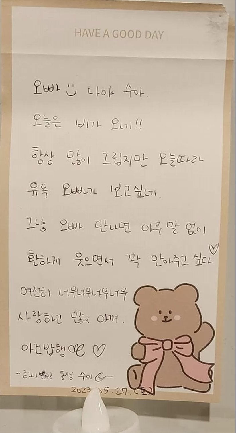 上月27日秀雅再次去到文彬的悼念空間祭奠哥哥,甚至留下第二封手寫信,在信中秀雅寫道:「哥哥,是我,秀雅,今天下雨了,雖然平時也很想你,但今天尤為想念,見到哥哥的話我會什麼都不說笑著擁抱你,依舊非常愛你珍惜你。 不要生病了,要健康喔,好好吃飯,希望你幸福...... 唯一的妹妹秀雅」字裡行間充滿著對哥哥的思念。