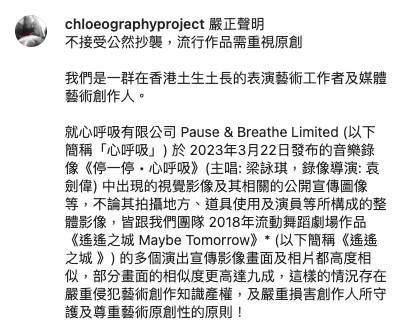 但日前CHLOEOGRAPHY PROJECT就在IG上出PO,以「嚴正聲明:不接受公然抄襲,流行作品需重視原創」為標題,指由梁詠琪主唱的音樂錄像《停一停 • 心呼吸》抄襲她們2018年的流動舞蹈劇場作品《遙遙之城Maybe Tomorrow》,更指MV中有多個演出宣傳畫面及相片都高度相似,部分畫面的相似度更高達九成,直指對方嚴重侵犯藝術創作知識產權。