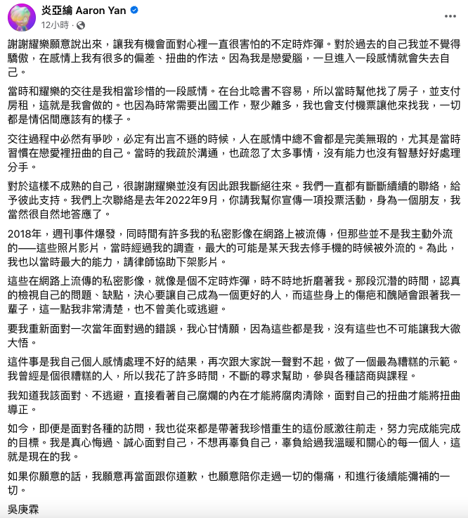 炎亞綸長文承認兩人曾交往