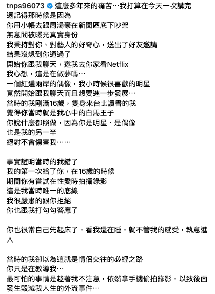 台灣Metoo風波繼續蔓延,日前台灣男星炎亞綸被有「抖音男神」之稱的網紅耀樂控訴在他年僅16歲時跟他發生性行為並偷拍影片外流,最後被始亂終棄。隨即炎亞綸在社交網承認兩人曾經交往,但強調兩人分開後關係一直很好,而且片段不是他主動流出。在炎亞綸發出聲明後,耀樂在深夜宣布今日中午會開記者會,勇敢說出事件的始末。