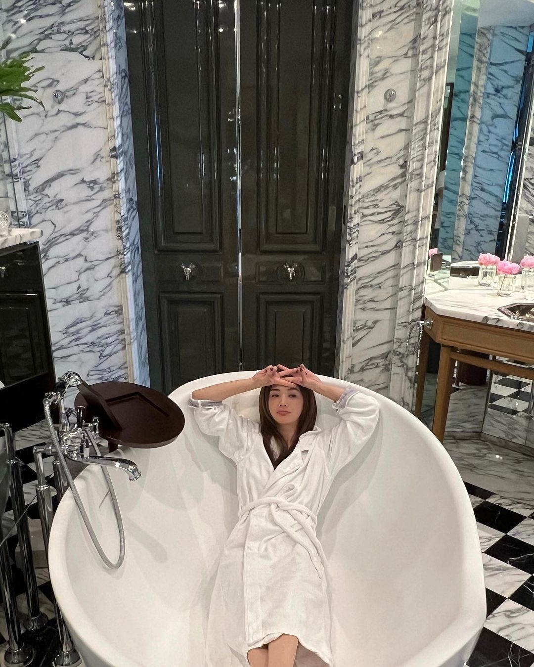 阿Sa上載了一張穿著白色浴袍躺在浴缸中的照片,並寫到:「我與我的閨蜜們在Rosewood度過了美好時光。謝謝你,#我無醉 #真係無 #講堅」雖然阿sa聲稱自己無醉,但相中的她臉頰通紅、高舉V字手勢,似乎喝了不少酒~而相中背景有多面鏡子,其中一面鏡的鏡邊反影出拍攝者的身影,細看可見拍攝者身穿白色T恤,肩膀寬闊,身材粗壯,看似是男士身材而並非阿Sa所講的「閨蜜」,相信是與富三代男友石恆聰一起度過甜蜜時光!