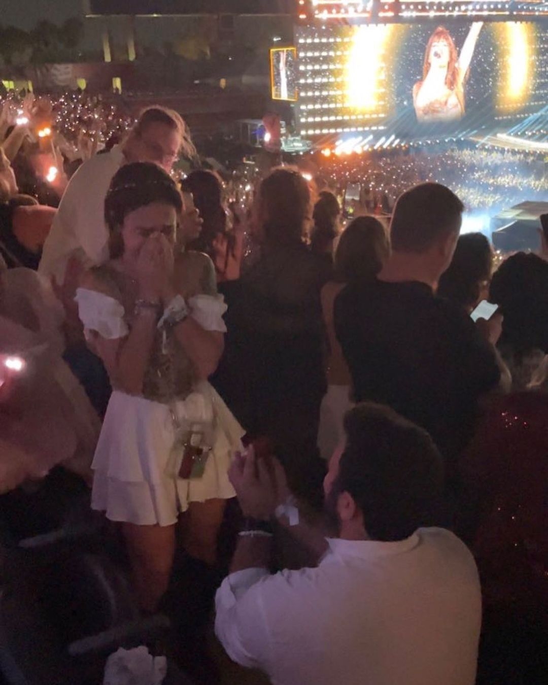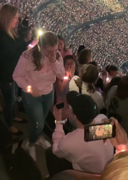 其實這已經不是第一次粉絲在Taylor Swift的演唱會上求婚,2018年在她的巡迴演唱會上,許多粉絲已經選擇在那一場演唱會下私定終生,還有粉絲直接在Taylor Swift面前上演求婚名場面,嚇得Taylor瞬間張大嘴巴,久久未能回復平靜~(笑)而之後Taylor Swift就於自己的IG上分享這件喜事,更打趣道自己是「Third Wheel」,是一顆電燈泡!