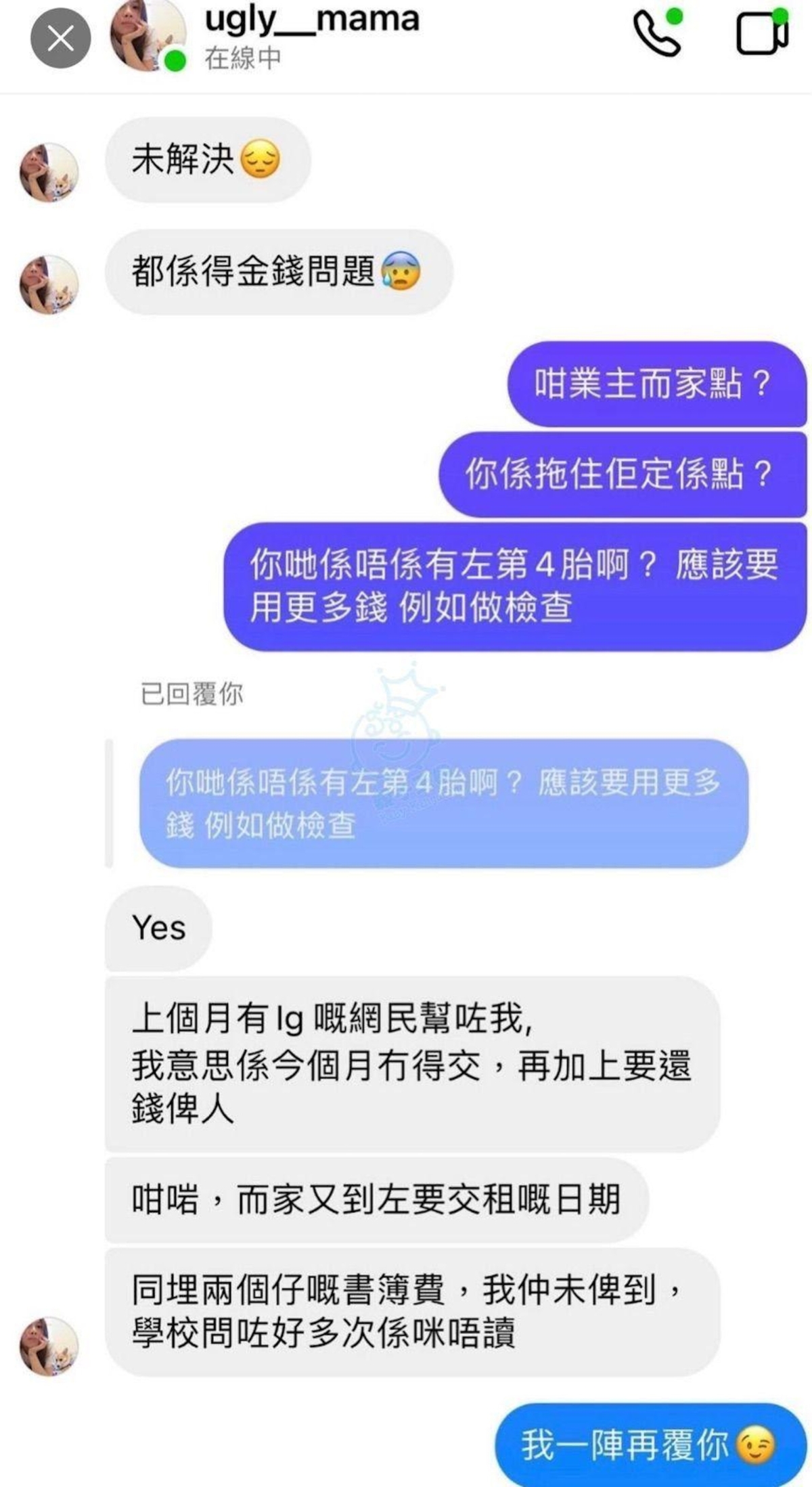 今日就有網友在討論區公開與雯雯的IG對話,可見網友問雯雯關於房租問題,雯雯回覆網友:「上個月有IG嘅網民幫咗我,我意思係今個月冇得交,再加上要還錢俾人,咁啱而家又到左要交租嘅日期,同埋兩個嘅書簿費,我仲未俾到,學校問咗好多次係咪唔讀。」透露原來她一直沒錢交房租,就連兒子的書簿費都沒有能力支付,面臨被退學危機,又自爆上個月是靠網友代交房租。
