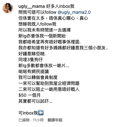 另一方面雯雯今日再更新IG帳號,指好多人inbox問她可否follow新的IG帳號,但雯雯不是很多人是真心關心她,但亦相信有媽媽是喜歡她的三個小朋友和狗仔,所以聽從網友意見將IG改行會員制度,給50蚊才可以關注她的新IG,她透露一來可以幫助到屋企經濟問題,二來可以阻止一啲用意不好的人,又稱有興趣的人可以inbox她。