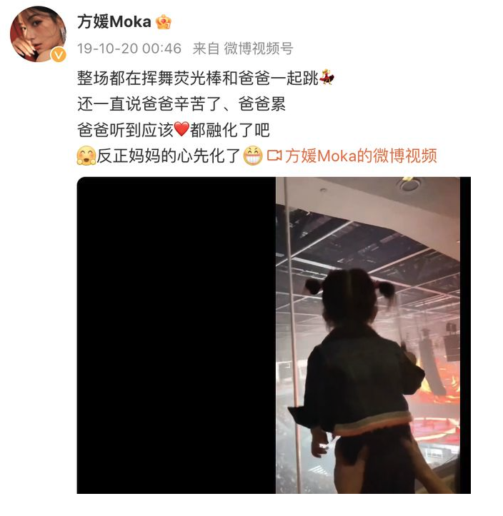要知道方媛每次在IG上分享兩個寶貝女兒的照片,都會使用可愛貼圖將女兒的樣子遮蓋住,但今次演唱會卻罕有地公開女兒的側臉,可以看得出女兒的臉部輪廓分明,小小年紀已經如此標緻,相信一定是遺傳了媽媽的美貌。因此有不少網民都留言大讚兩個女兒超級可愛,更說「可愛的小小歌迷!好幸福,有女萬事足」等。