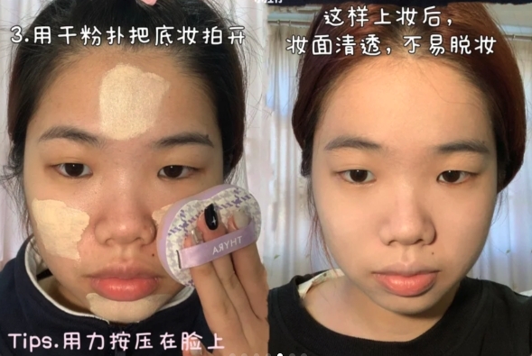 如果比較容易暗沉的女生,則可以將粉底液混合少量的粉色妝前底霜,能有助增強粉底的通透感。記得暗瘡皮膚上粉底一定要夠薄、夠均勻,並少量多次,千萬不要為了追求高遮瑕度就厚塗。其後再次使用美妝蛋輕印全臉。
