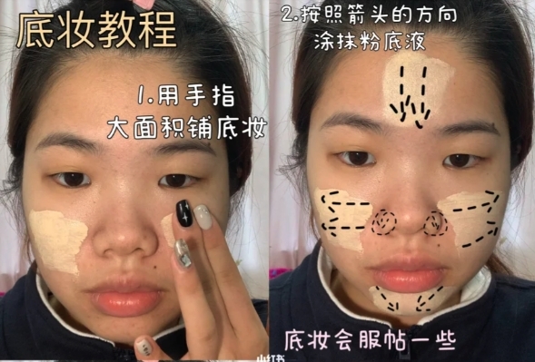 化妝博主「Bo」表示妝前一定要做好保濕補水,之後才上底妝產品。在粉底色號上,她建議選擇比較白皙的色號,這樣可以使臉部更乾淨一點。而質地則要選擇清透自然的,可減低之後出現卡粉的機會。