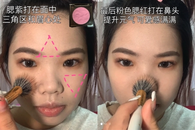 化妝博主「Bo」在這個妝容中一共使用了三種顏色的胭脂,分別是粉色、橙色、紫色。她強調最好選擇質地比較軟糯的胭脂,上色度會更好!