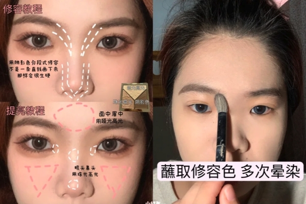 而提亮方面,則可以在面中、眉中使用啞光高光,在眼頭、鼻頭則用珠光高光,瞬間有助提升幼態感。