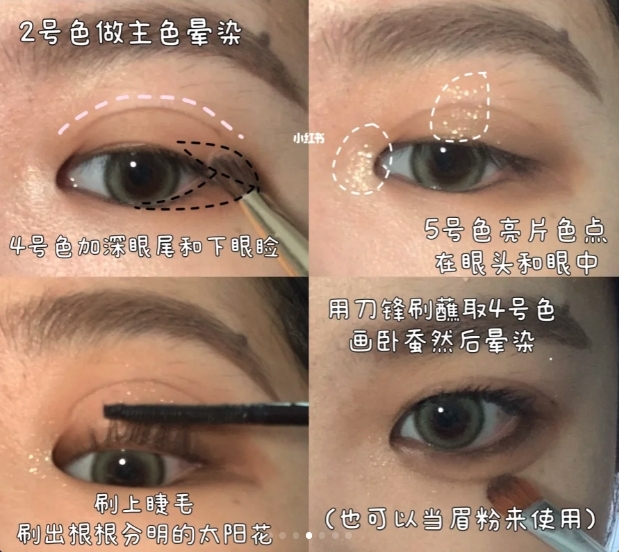 之後先使用米色作為眼部打底,可使後續塗抹的眼影更顯色,再使用淡啡色大面積地塗在眼皮上,再使用深一點的啡色加深在眼尾和下眼瞼,再使用亮片色點在眼頭和眼中,令雙眼看起來blingbling~最後再掃上睫毛和畫上臥蠶就完成了!