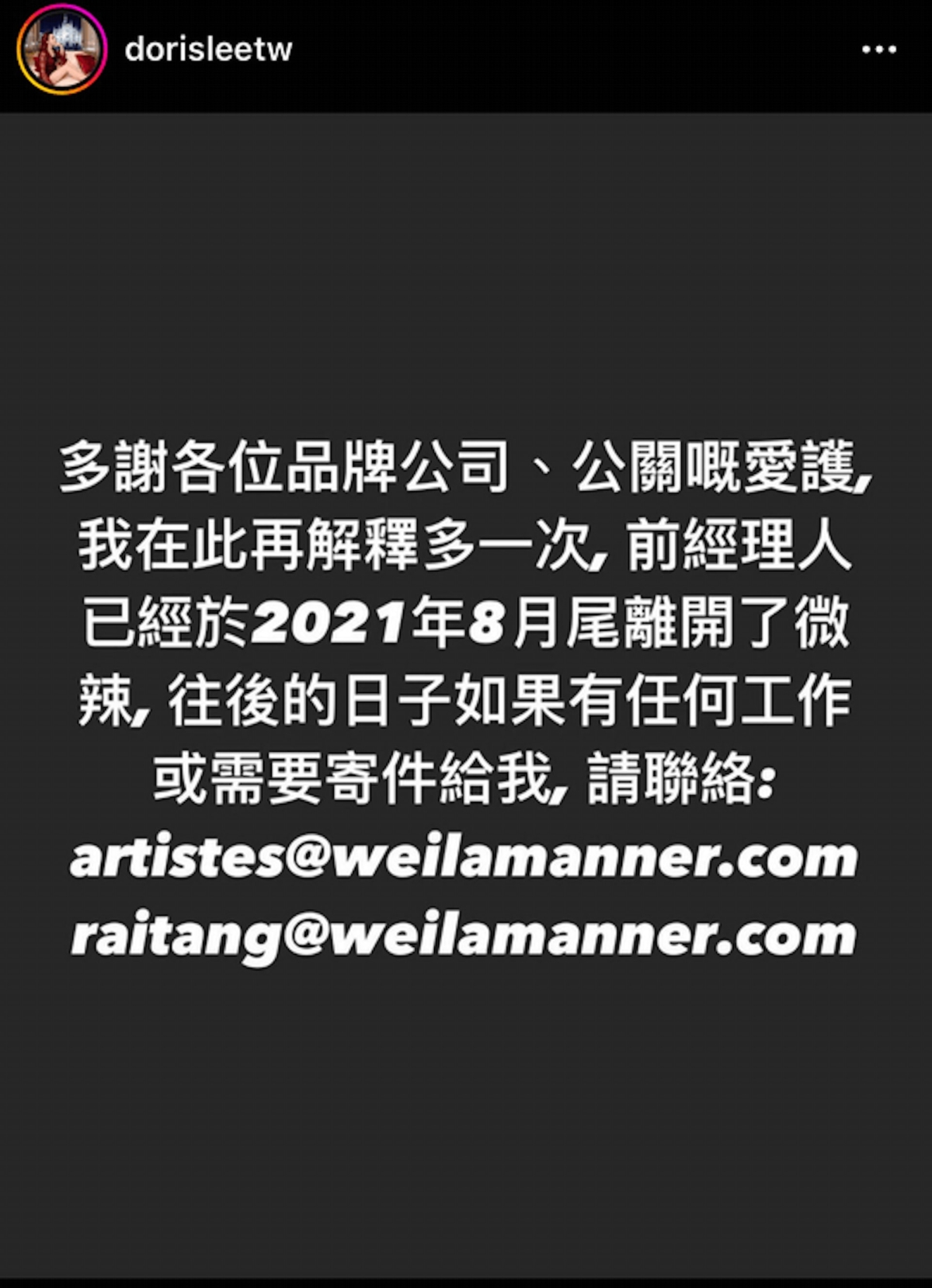 阿晶在2021年離開微辣,在22年1月微辣藝人Doris曾出Post叫PR寄公關品不要寄錯地址:「前經理人已經於2021年8月尾離開了微辣,往後的日子如果有任何工作或需要寄件給我,請聯絡……」其他微辣成員都有Share這個Post。不過由於當時阿晶有在自己IG分享化妝品宣傳Post,就被質疑她搶了原屬Doris的公關品,但事後阿晶貼出多張與PR的對話力證自己清白,證明是PR主動邀請她出Post及寄產品給她,否認搶微辣藝人Job。