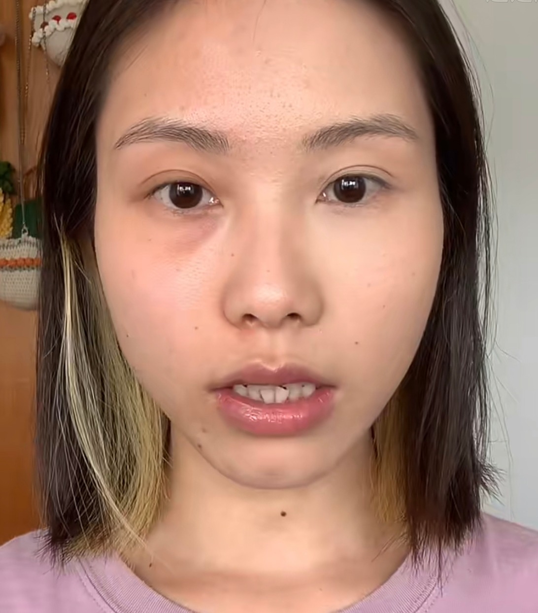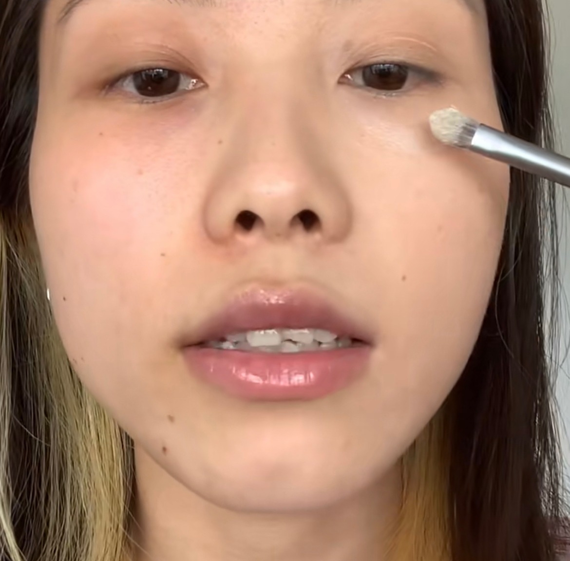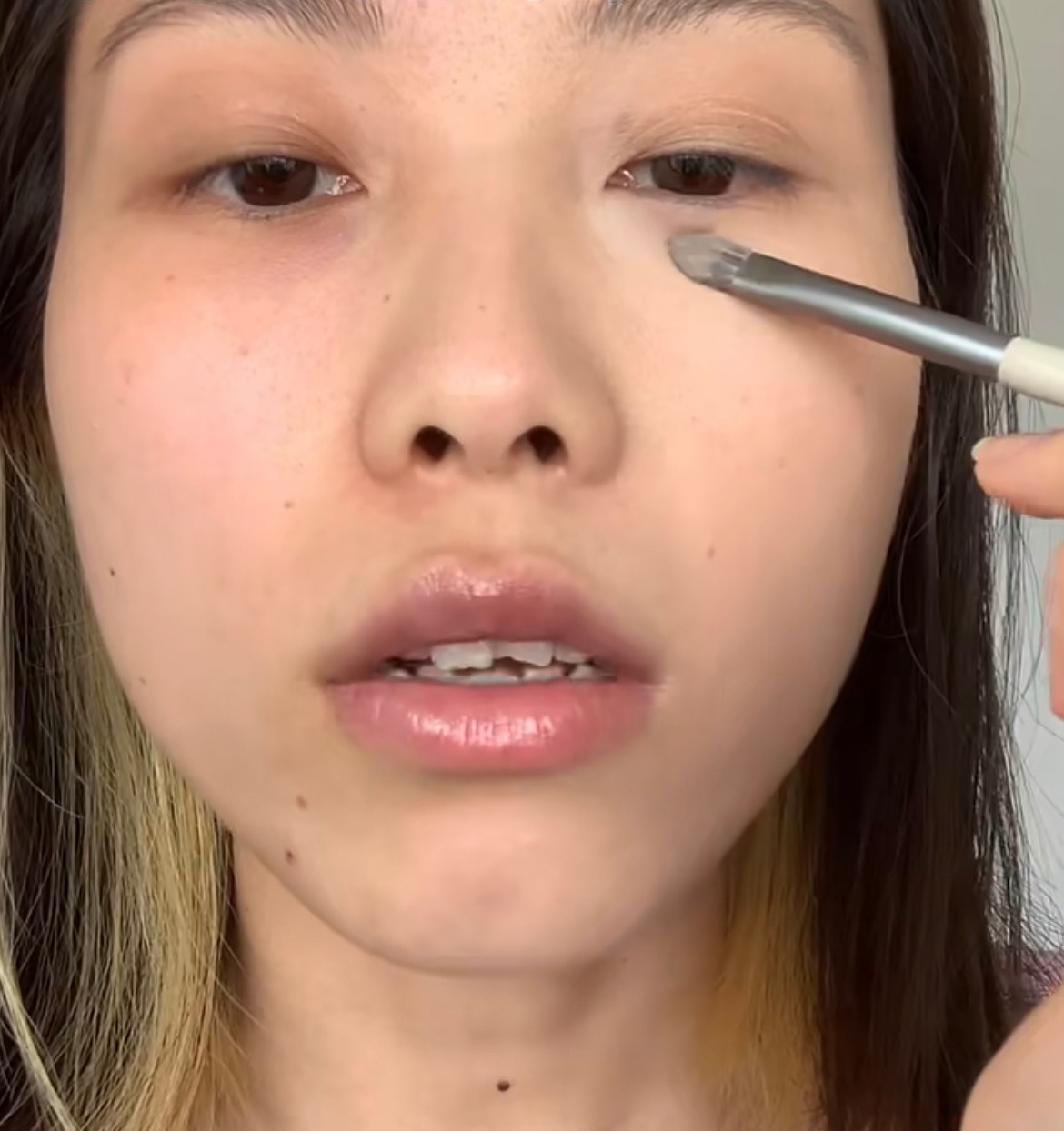 之後「哩離李粒」又提到不建議大家畫三角形、一條斜線,原因是很難精準提亮到正確的位置,而且還會令眼底的妝感很厚重。她建議利用化妝掃沾取提亮色後,塗在手背上,再取超薄的一層即可,之後平視望著鏡子,找出淚溝最深的位置,再直接把遮瑕蓋上去,利用顏色讓淚溝從視覺上消失。