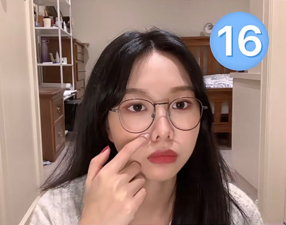 如果直接用碎粉定妝,淚溝可能很快又會跑出來,所以「哩離李粒」建議先沾取一點亮粉,再把頭抬起來找出亮亮的位置,把亮粉塗抹在上面把它定住,再不斷往上往下把它舖開,便會發現淚溝已完全消失不見了。最後臉部定妝記得一定要避開眼部的位置啊!