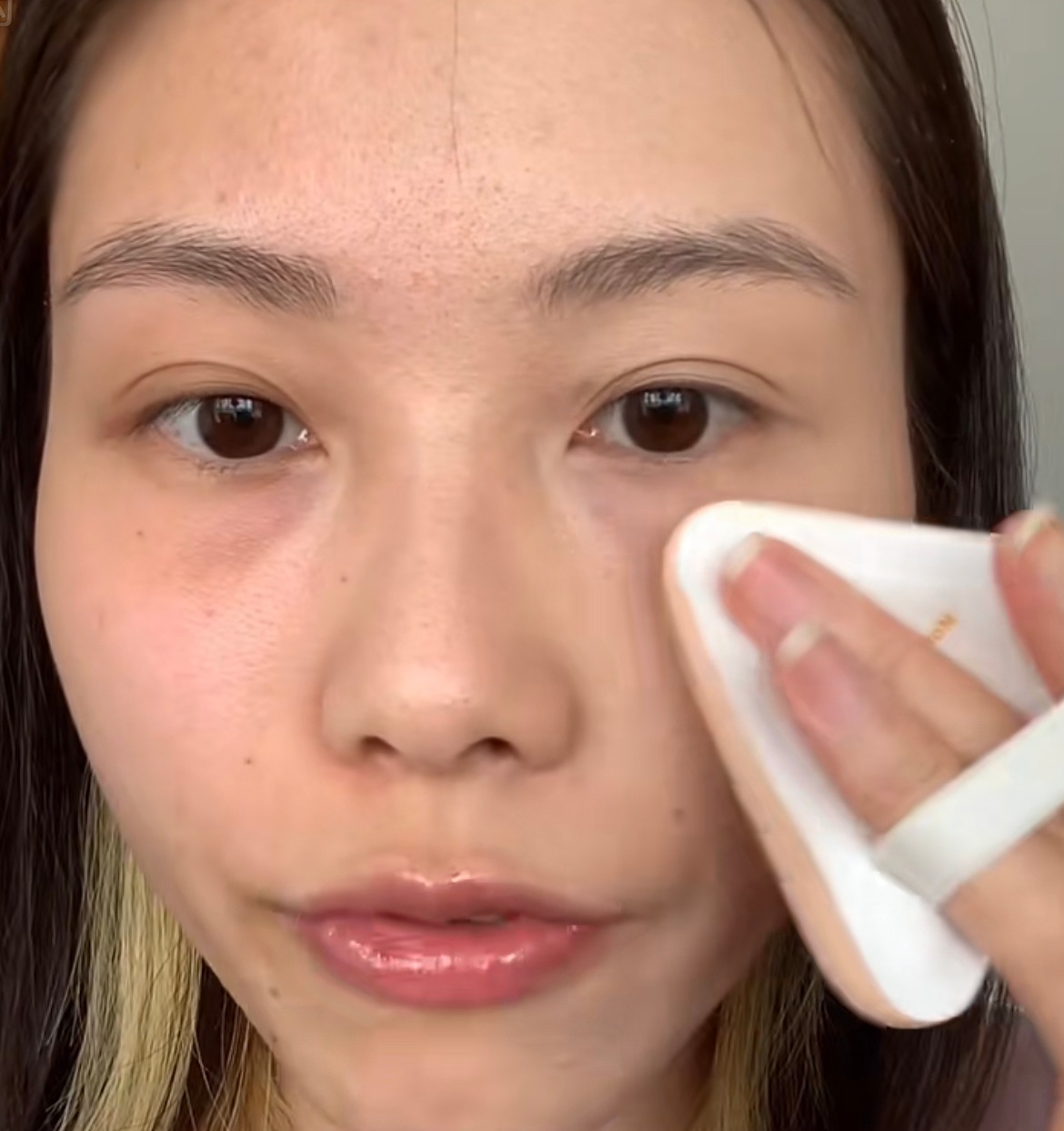 遮蓋黑眼圈後,會看到淚溝非常明顯,這是很正常的不用擔心!之後「哩離李粒」提到,臉部提亮一定要在粉底之後,其中提亮淚溝也屬於臉部提亮,所以下一步先上粉底。上粉底的時候,眼周的位置記得不要用力去拍,只需要用粉撲上的餘粉輕輕按壓眼周即可,這樣才不會帶走黑眼圈的遮瑕。