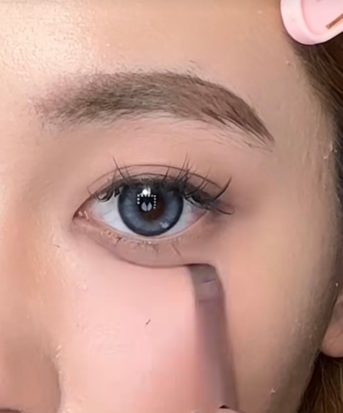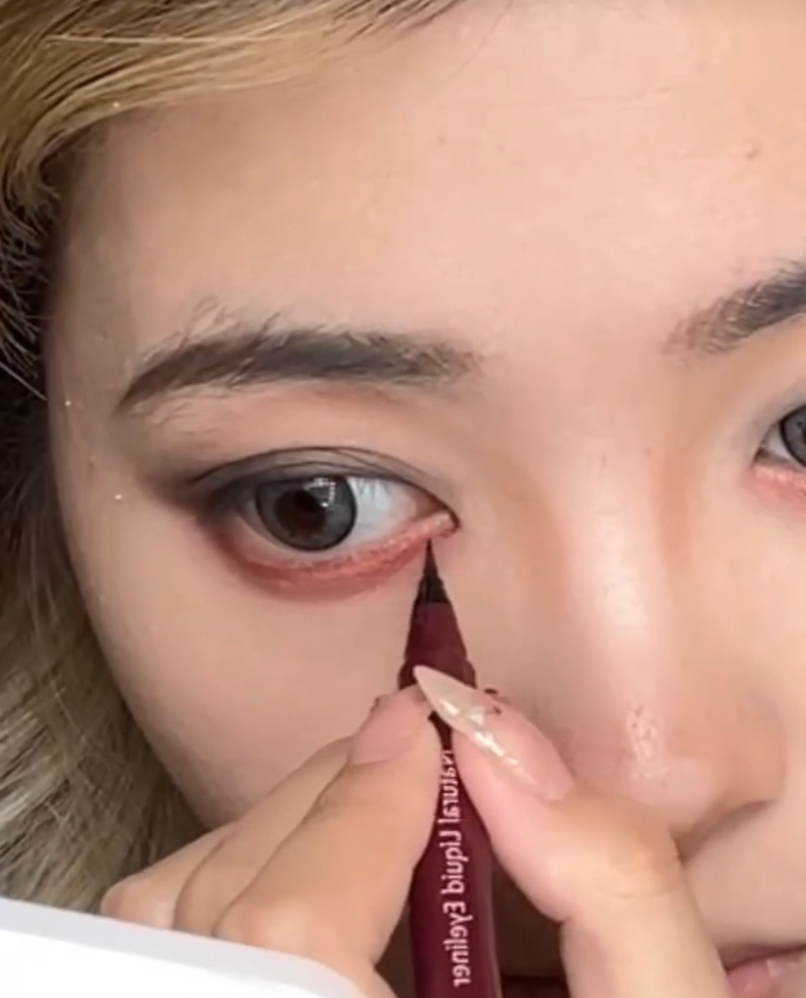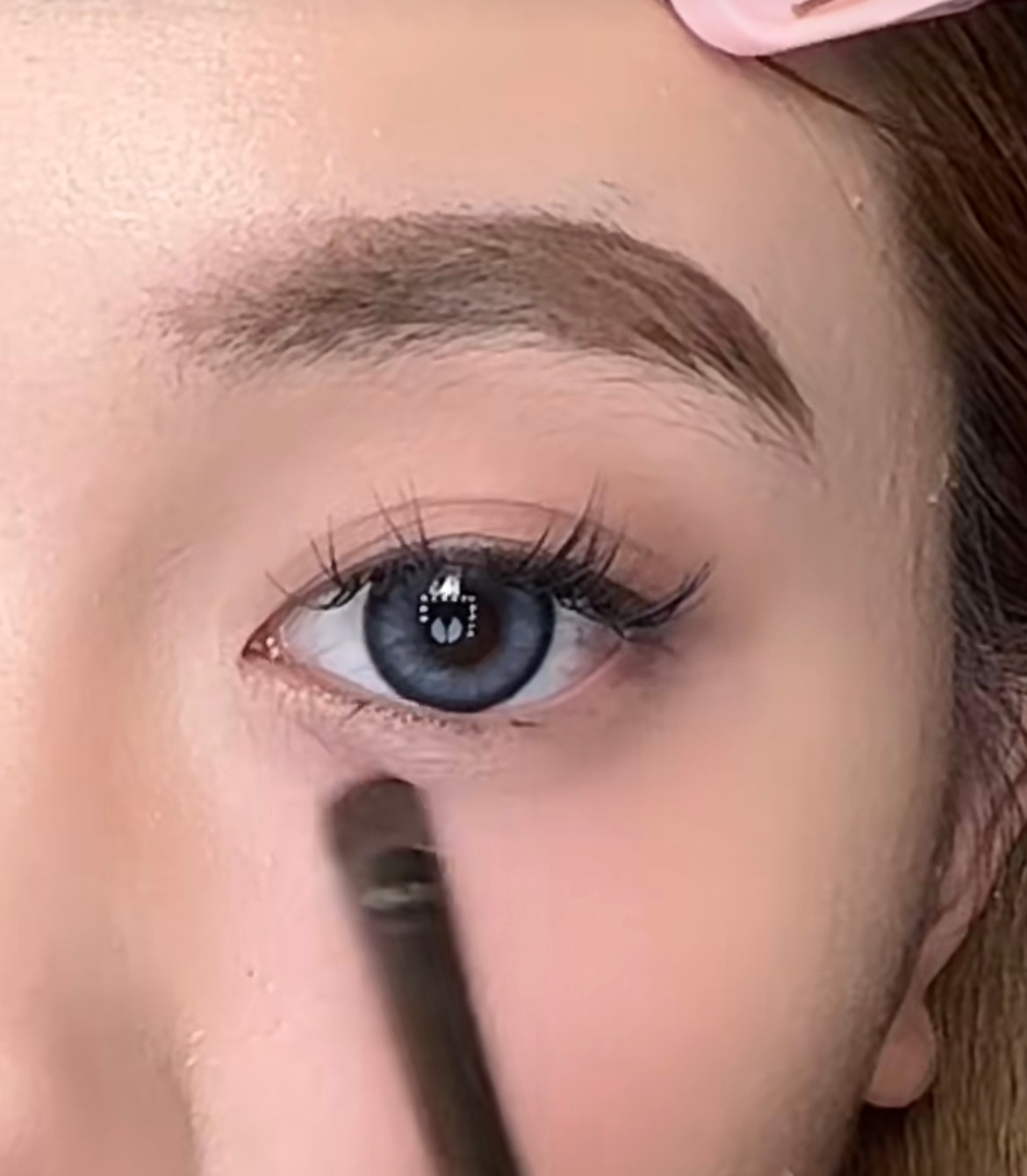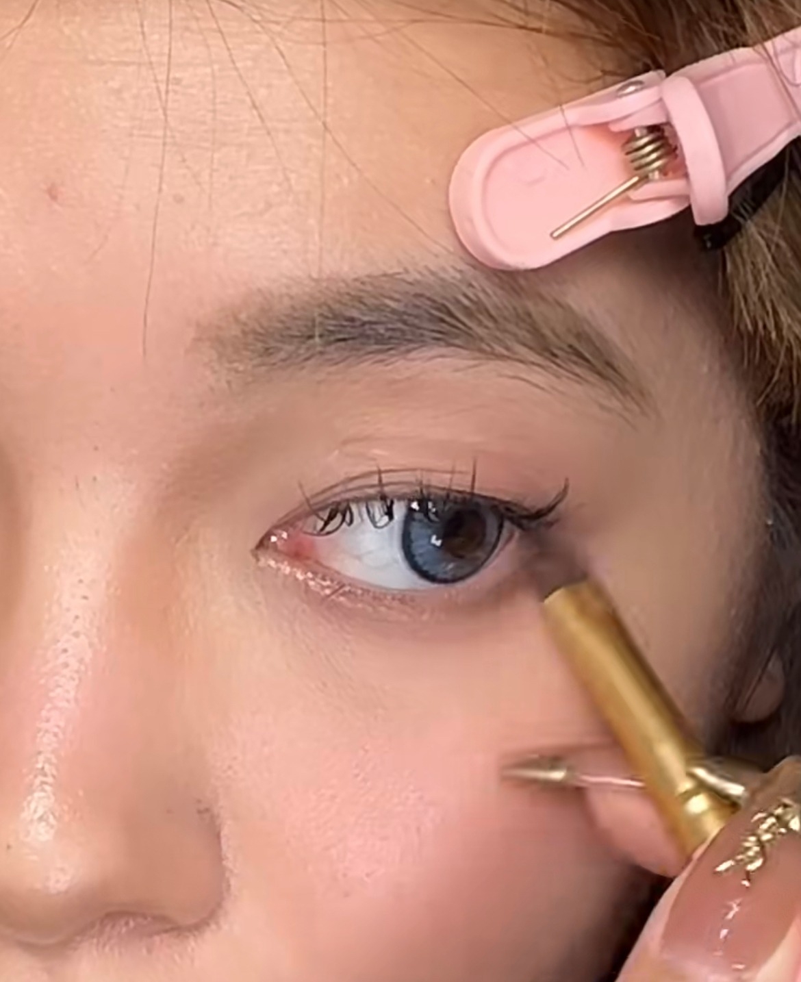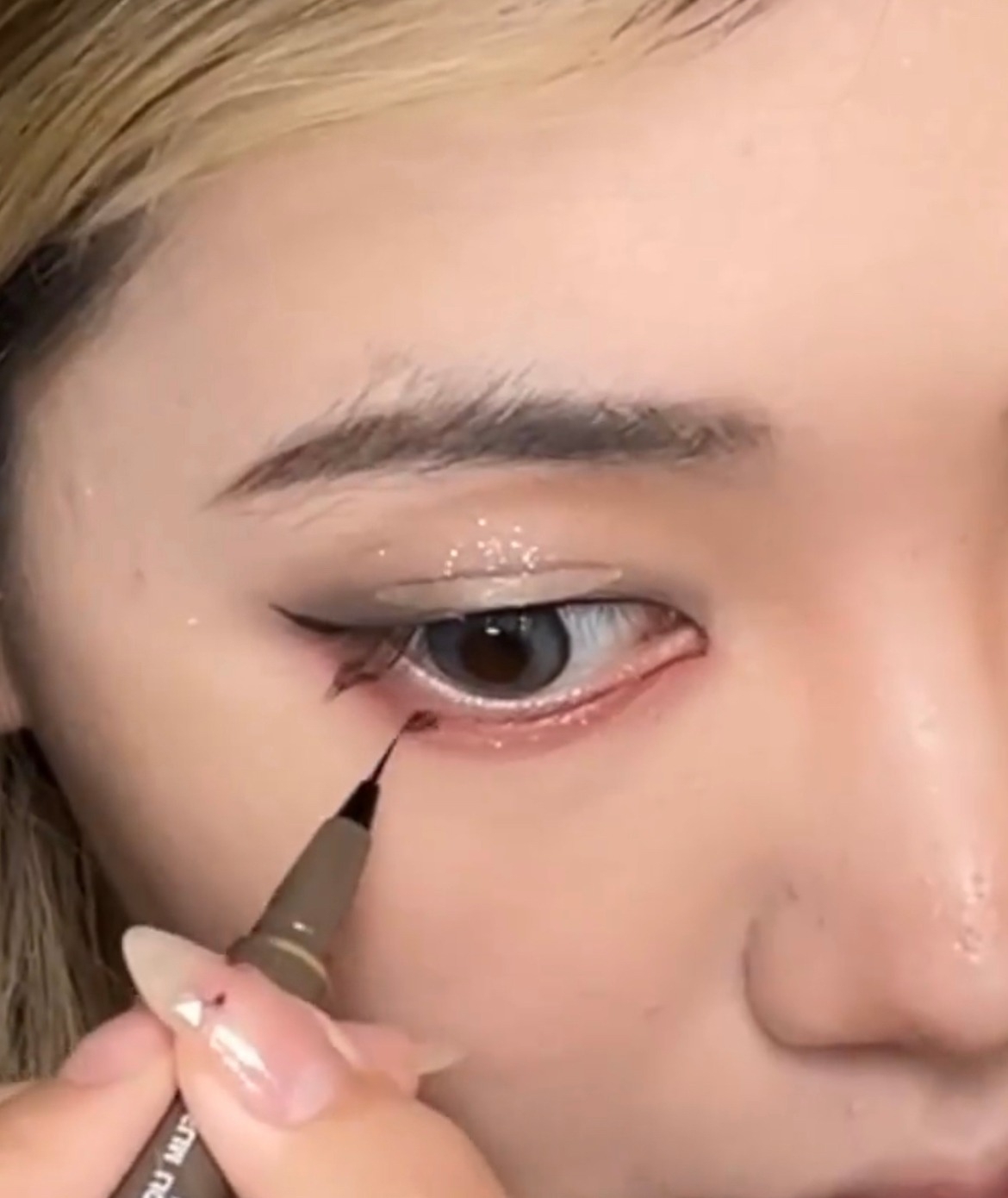 之後使用深啡色眼線勾出眼下輪廓,再用珠光色提亮眼中部分。
