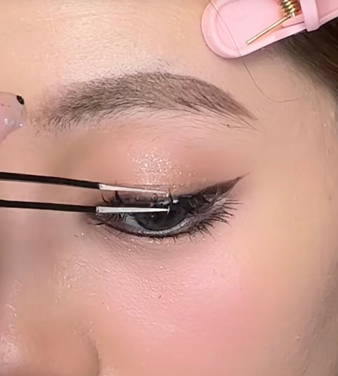 其後沾取淺色系亮片眼影提亮眼中的部分,讓眼皮亮亮的,再畫上揚的眼線、貼上上下假睫毛。