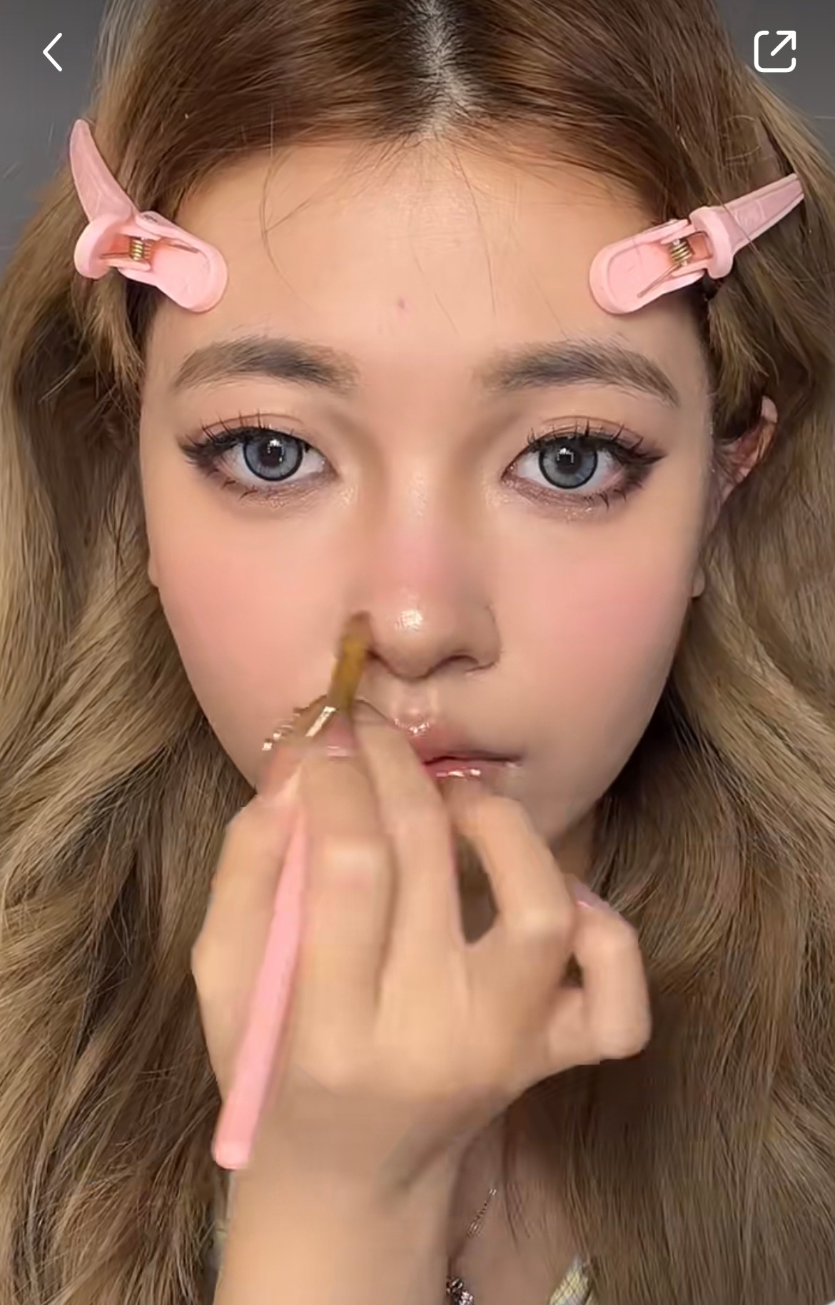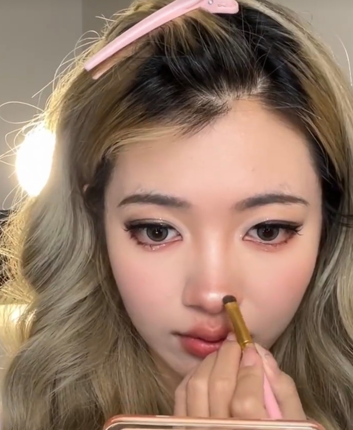 化好底妝後,先使用修容筆在鼻樑和鼻翼兩邊畫出陰影線,令鼻子立體一點,再使用化妝掃暈開。接著使用粉嫩色的胭脂點壓在臉頰和鼻樑中間,令皮膚透出自然可愛感。