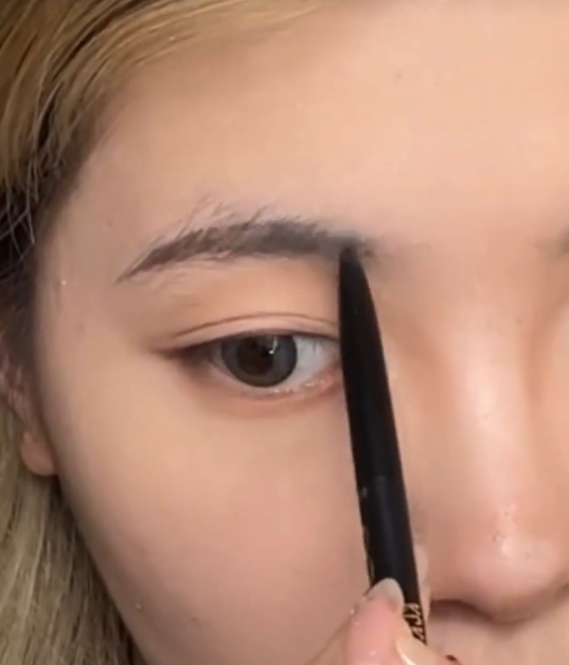 之後畫上一條平眉即可,眼影部分使用粉嫩色在眼皮上打底,再沾取暗粉色加深眼尾、下眼瞼、眼頭部分,再沾取淺啡色在眼睛內側進行加深。