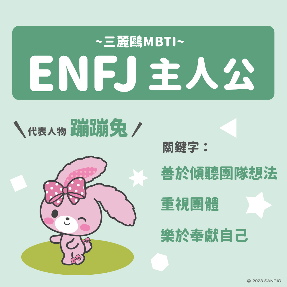 ENFJ的代表角色是BONBONRIBBON,他們善於傾聽團隊想法,又重視團體,樂於奉獻自己。ENFJ的人做事有企圖心,在團隊中能建立優良的形象,擅於與人合作,很適合做團體的領導!
