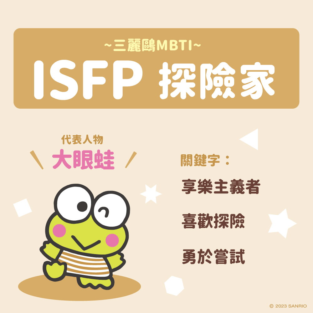 ISTP的代表角色是Keroppi,這類人是名乎其實的享樂主義者,他們喜歡探險又會勇於嘗試!ISFP冒險家被稱充滿感性的藝術家,他們喜歡與人交往,充滿著獨特魅力、又容易受人喜愛,但意外地是內向的人格呢~