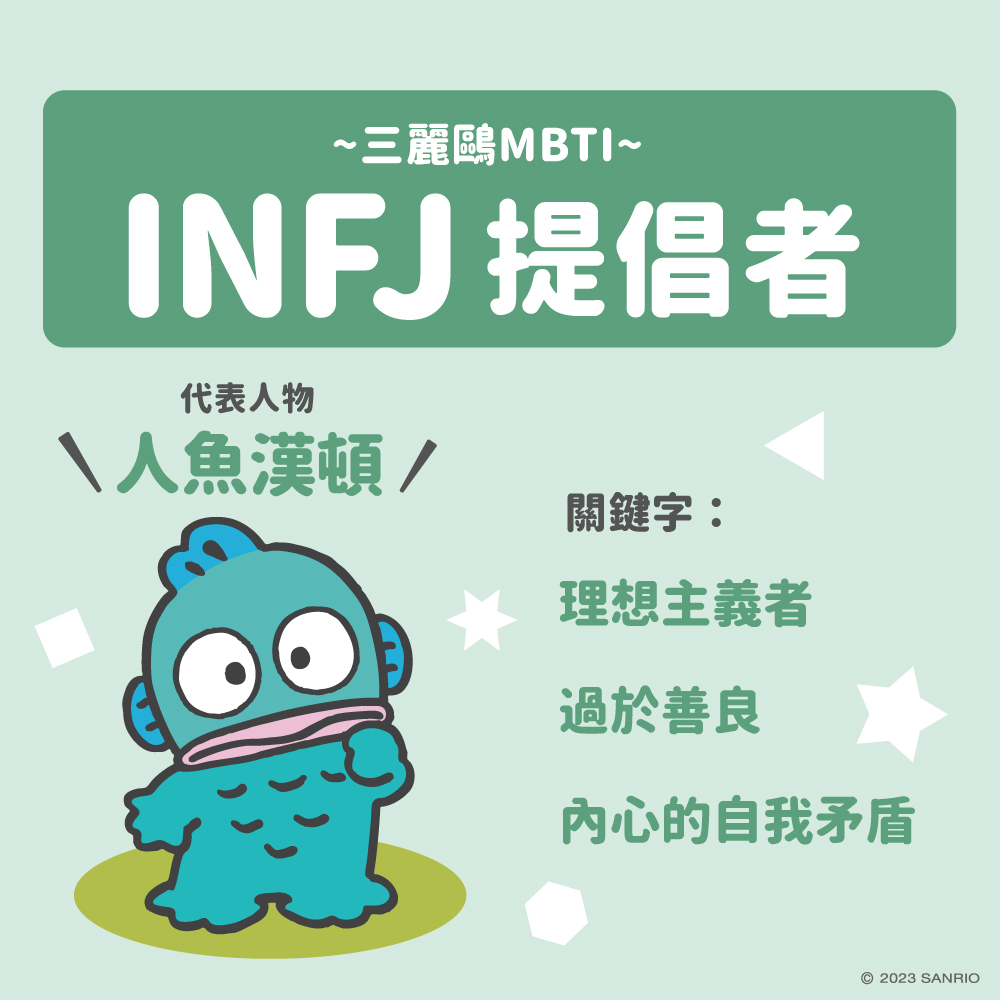 INFJ的代表角色是HANGYODON水怪,他們是理想主義者,不過性格過於善良,內心也有不少自我矛盾。INFJ的性格內斂,不擅於交際,但為人心思細密,懂得察言觀色,處處為人著想,又可以包容別人的壞情緒。