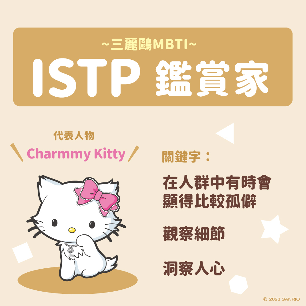 ISTP的代表角色是Charmmy Kitty,這類人在人群中有時會顯得孤僻,但善於觀察細節,又能夠洞察人心。ISTP看似內向寡言,但實際上是非常好動且具有旺盛好奇心的人,愛用自己的雙手和眼睛探索世界及累積經驗,是「天生的創造者」~