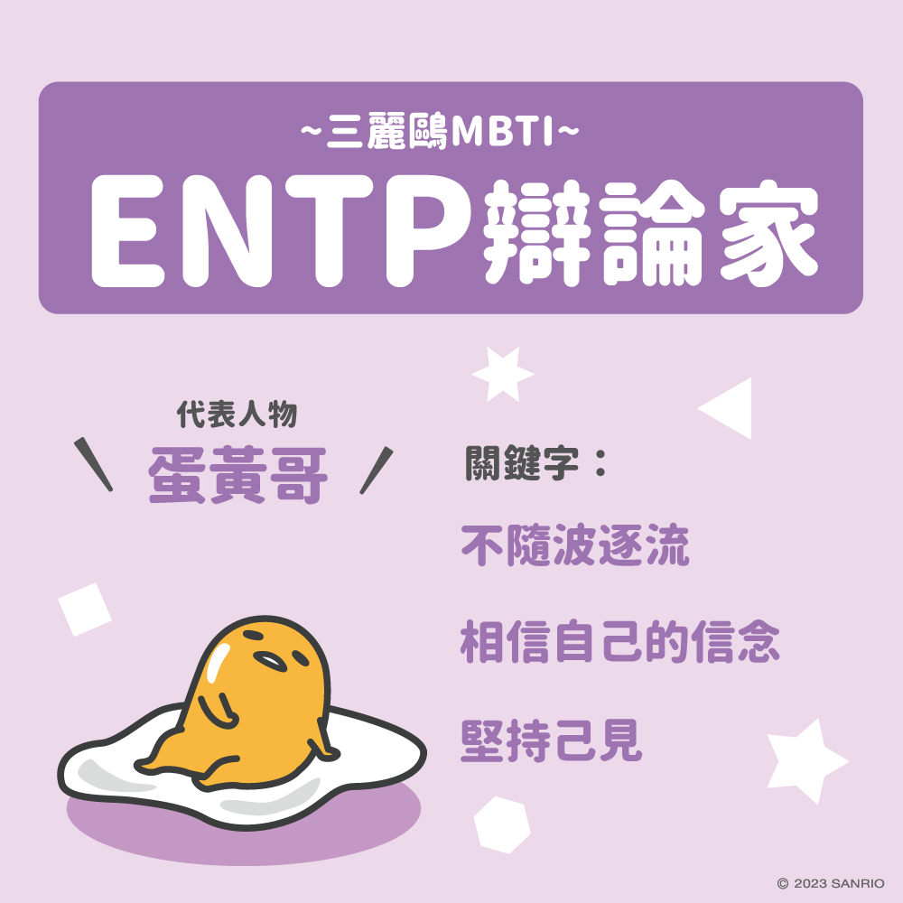 ENTP的代表角色是蛋黃哥,他們的性格不輕易隨波逐流,又會相信用自己的信念,堅持己見。ENTP性格外向喜歡與人接觸,會為自己感興趣的話題與其他人進行辯論!