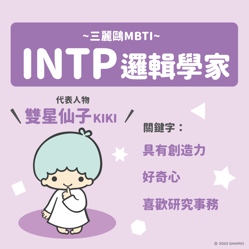 INTP的代表角色是Little Twin Stars的弟弟Kiki,他們具有創造力,又充滿好奇心。他們擅長理性思考,不擅於以言語表達情感,在人群中是安靜的存在。
