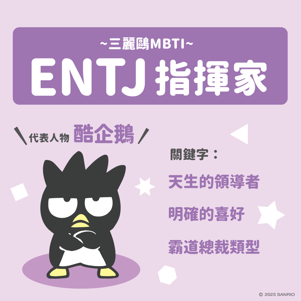 ENTJ的代表角色是XO仔,他們是天生的領導者,有著明確的喜好,是霸道總裁類型。ENTJ性格比較外向,擁有很強的行動力及聰明的頭腦,一旦訂立了目標後就會帶領團隊向目標進發。