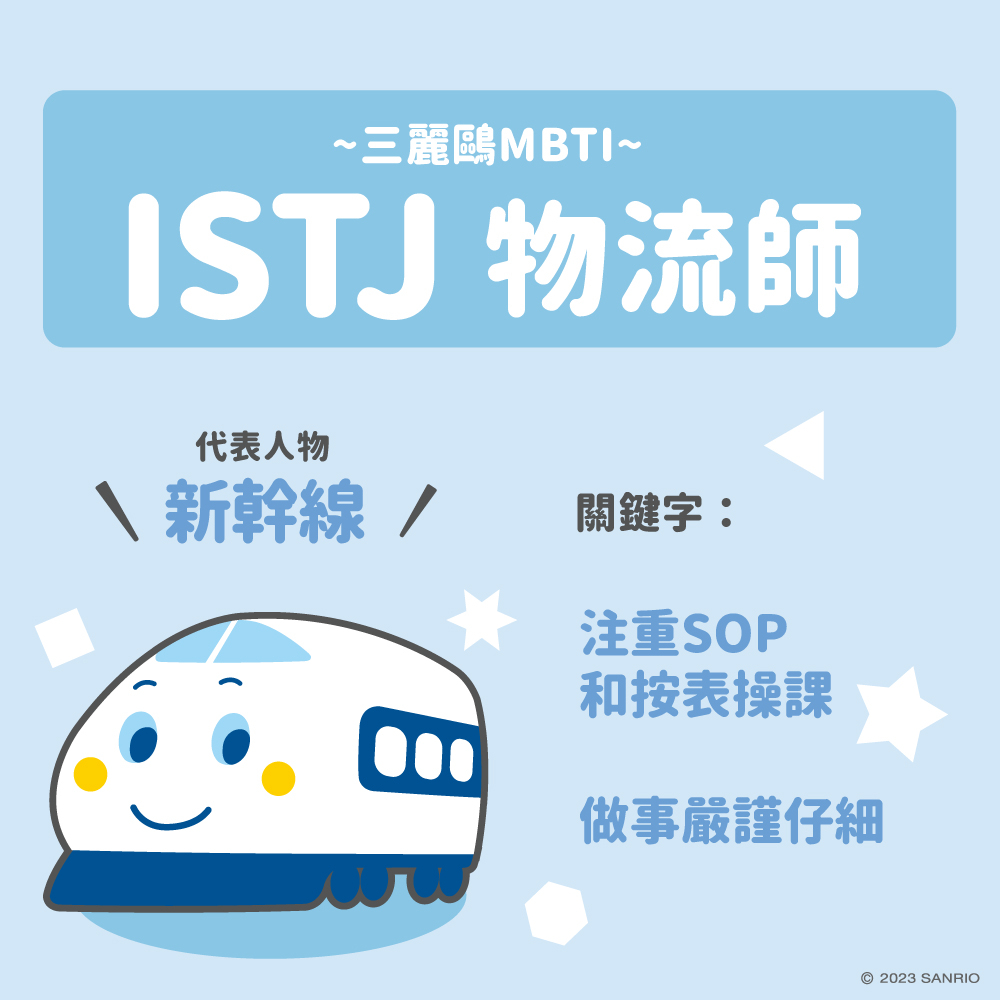 ISTJ的代表角色是新幹線,他們的性格比較按步就班,做事謹慎又仔細。ISTJ的個性正直、務實,他們會專注於完成目標所做的每個任務,寧願自己解決問題都不會依賴別人。