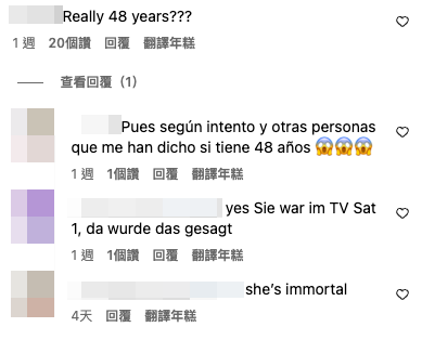 其中更有來自土耳其的網民在她的另一張慶生照下留言:「你幾歲?看起來像在慶祝18歲生日」,隨後獲其他網民回覆是48歲,他即表現得非常驚訝並回應:「48歲是真的嗎?」。