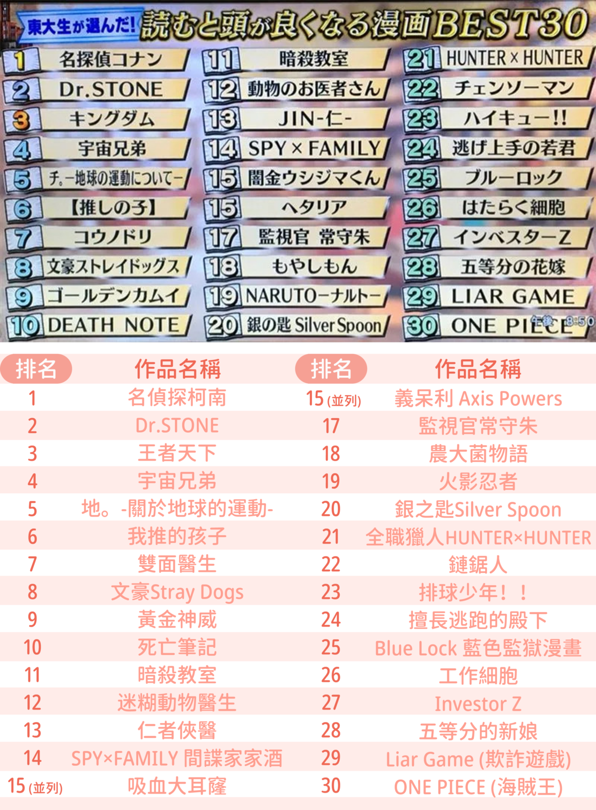 日本漫畫一直是年輕人愛看的讀物之一,近年有不少日漫改編的動漫或是電影都十分受歡迎,像是《SPY×FAMILY間諜家家酒》、《我推的孩子》等,更是掀起一陣熱潮!而日本綜藝節目《林修の今知りたいでしょ!》最近就以最能代表日本文化之一的「漫畫」為主題,找到300名正在就讀日本第一學府「東京大學」的學生做問卷調查,以包含各領域知識或很有學習價值的漫畫作品為標準,選出「看完會變聰明的漫畫 BEST 30」,大家也來看看你喜歡看的漫畫有沒有上榜吧!