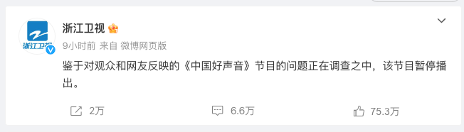 根據浙江衛視官方微博表示:「鑒於對觀眾和網友反映的《中國好聲音》節目的問題正在調查之中,該節目暫停播出。」目前最新一季的《中國好聲音》是由周華健、潘瑋柏、薛之謙及劉憲華擔任導師,如今宣布停播,無疑讓導師和學員們無辜遭受波及。