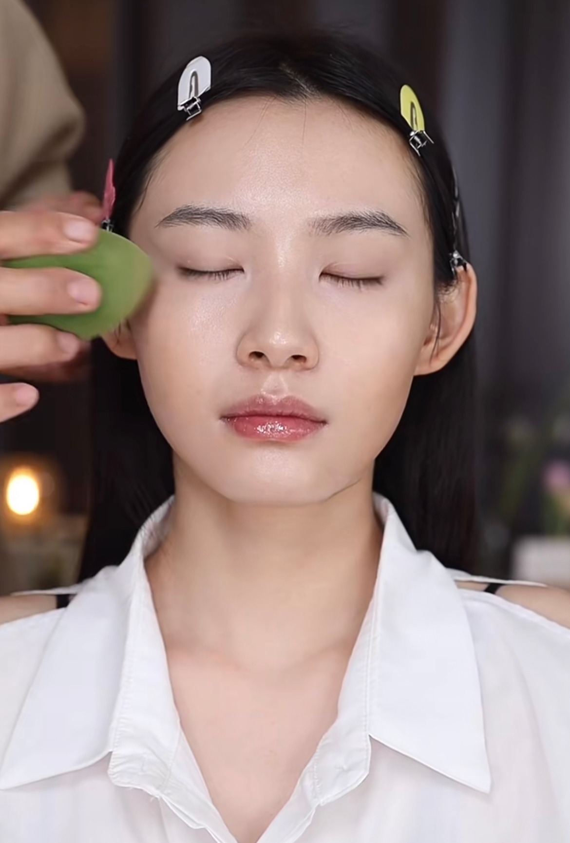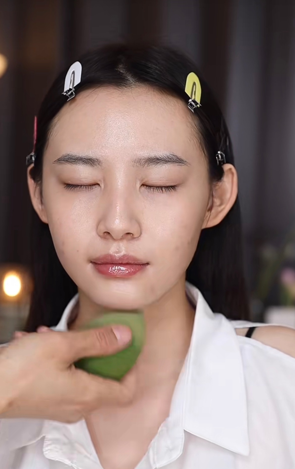 如果比較容易暗沉的女生,則可以將粉底液混合少量的粉色妝前底霜,能有助增強粉底的通透感。記得暗瘡皮膚上粉底一定要夠薄、夠均勻,並少量多次,千萬不要為了追求高遮瑕度就厚塗。其後再次使用美妝蛋輕印全臉。