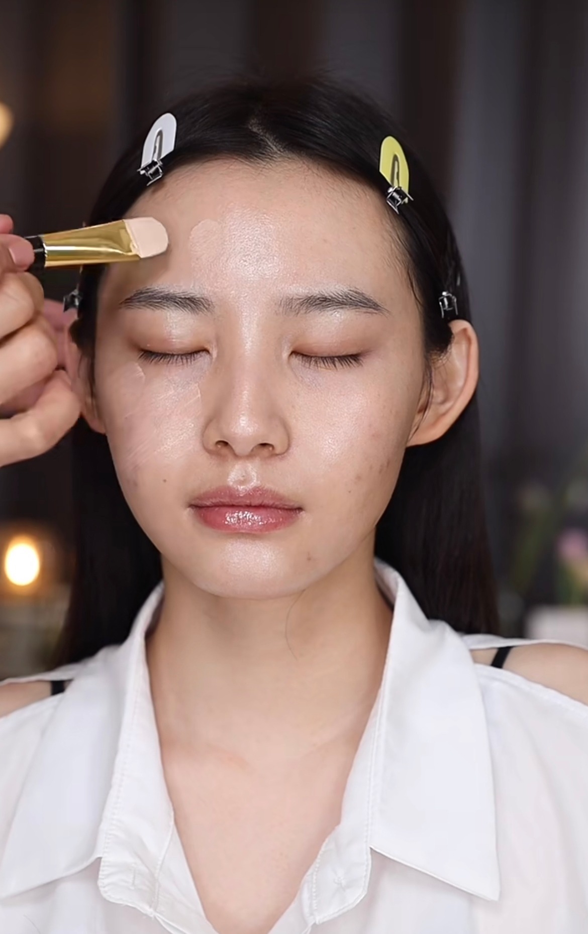 先全臉上粉底,再重點遮瑕,打造自然無瑕的底妝。