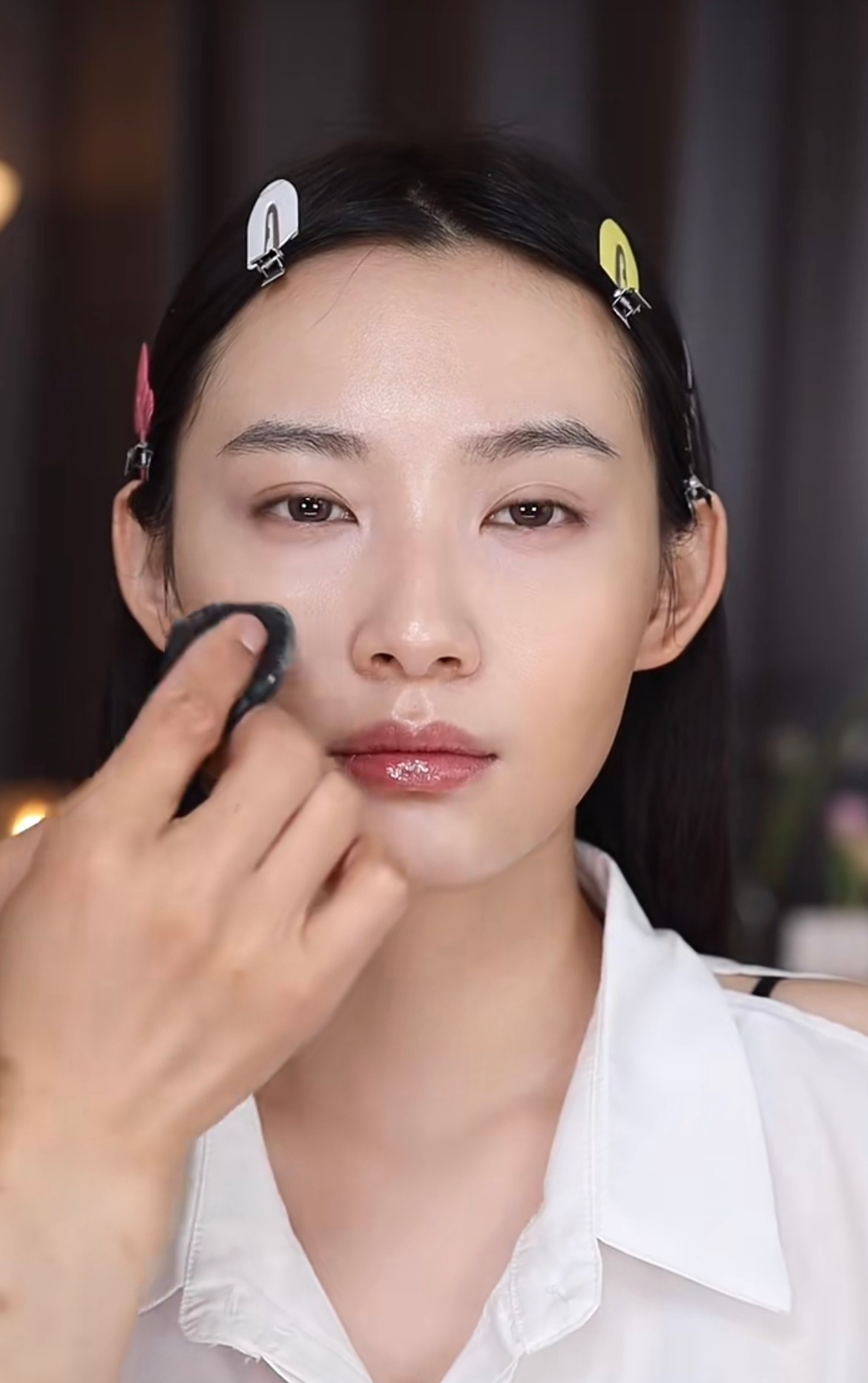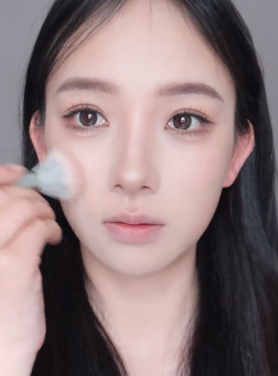 然後「胡還行」提到這個妝容的重點是要突出臉部的折疊度,令臉部看起來更加立體,因此需要提亮臉中、鼻基底、唇周、眉弓骨、額頭的位置,在使用粉撲拍打時原地拍開即可,不要弄花底妝。