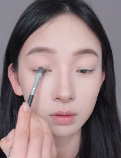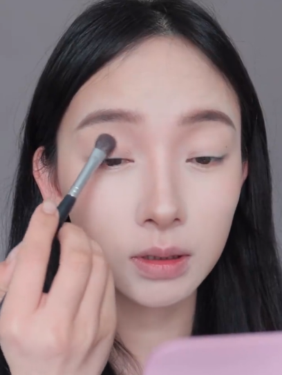 先沾取淺啡色眼影掃在整個眼皮和眼底,再混合淺啡色和深啡色疊加在雙眼皮的褶皺處,然後再慢慢向上掃,增加層次感。