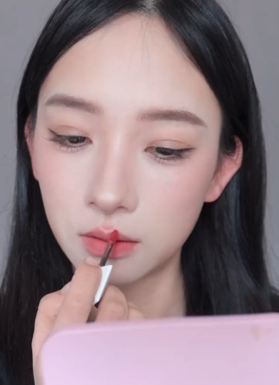 選擇低飽和度的眼影,從顴骨位置開始向內掃,又在眼下和鼻頭位置輕輕掃開。最後再塗上紅色唇彩就完成了!