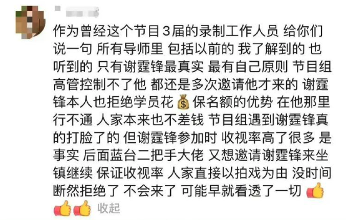 雖然這則爆料未經過證實,但網民仍然大讚謝霆鋒為人正直,有人留言:「我敬佩他,帥爆了」、「難怪謝霆鋒選到再強的學員都沒拿過冠軍」、「謝霆鋒一向是有口碑的藝人,敬業不耍大牌」等。也有人說:「他的背景後台夠硬,當然可以拒絕」。