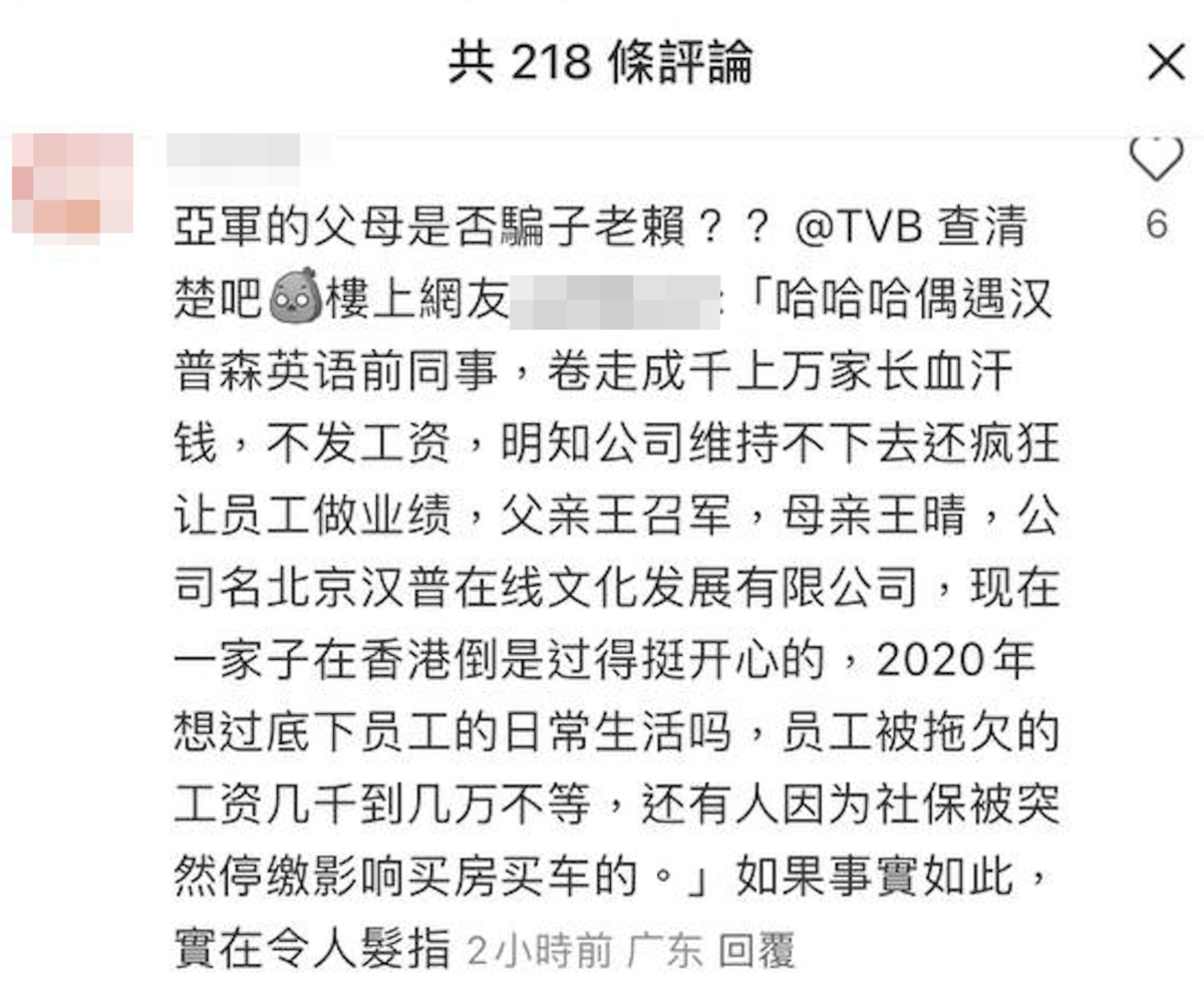 近日就有大量苦主在內地社交平台爆料,指控新鮮出爐的港姐亞軍王怡然父母是「補習天王」,在內地十多個城市經營補習社,不過補習社卻突然在2020年倒閉後,拖欠上千員工的工資及騙取過千家長學費合共過千萬,苦主維權勝訴都得不到賠償,如果王怡然一家捲款逃至香港。不少網友斥TVB沒有做好家庭背景審查,希望無綫出面主持公道,如查明屬實後應該褫奪其亞軍名銜。