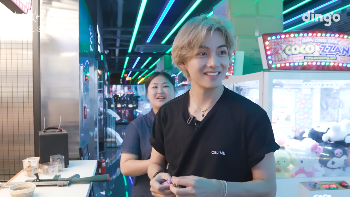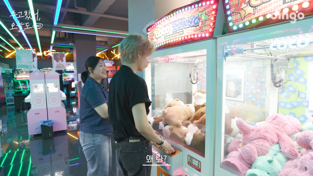 兩人一起用膳後,V答應完成河英的願望清單,先帶她去了遊戲廳,兩人一起打機、夾公仔,射擊遊戲時,還獲得了同款情侶吊飾。隨後兩人一起去拍了貼紙相,河英更親手幫V戴上頭飾合照,真的超幸福,羨煞旁人!