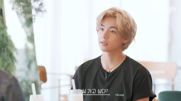 節目中V以一頭金色頭髮、休閒穿搭登場,特意坐在河英的後面給她一個驚喜。V溫柔地呼喚河英的名字,河英當場嚇得從椅子上站起,掩臉發呆,並不斷懊惱表示:「早知我今天用心點化妝了。」V見狀也索性將外套脫掉,並表示:「我今天本來想說要耍帥,那就算了吧!」成功讓氣氛變得輕鬆起來。
