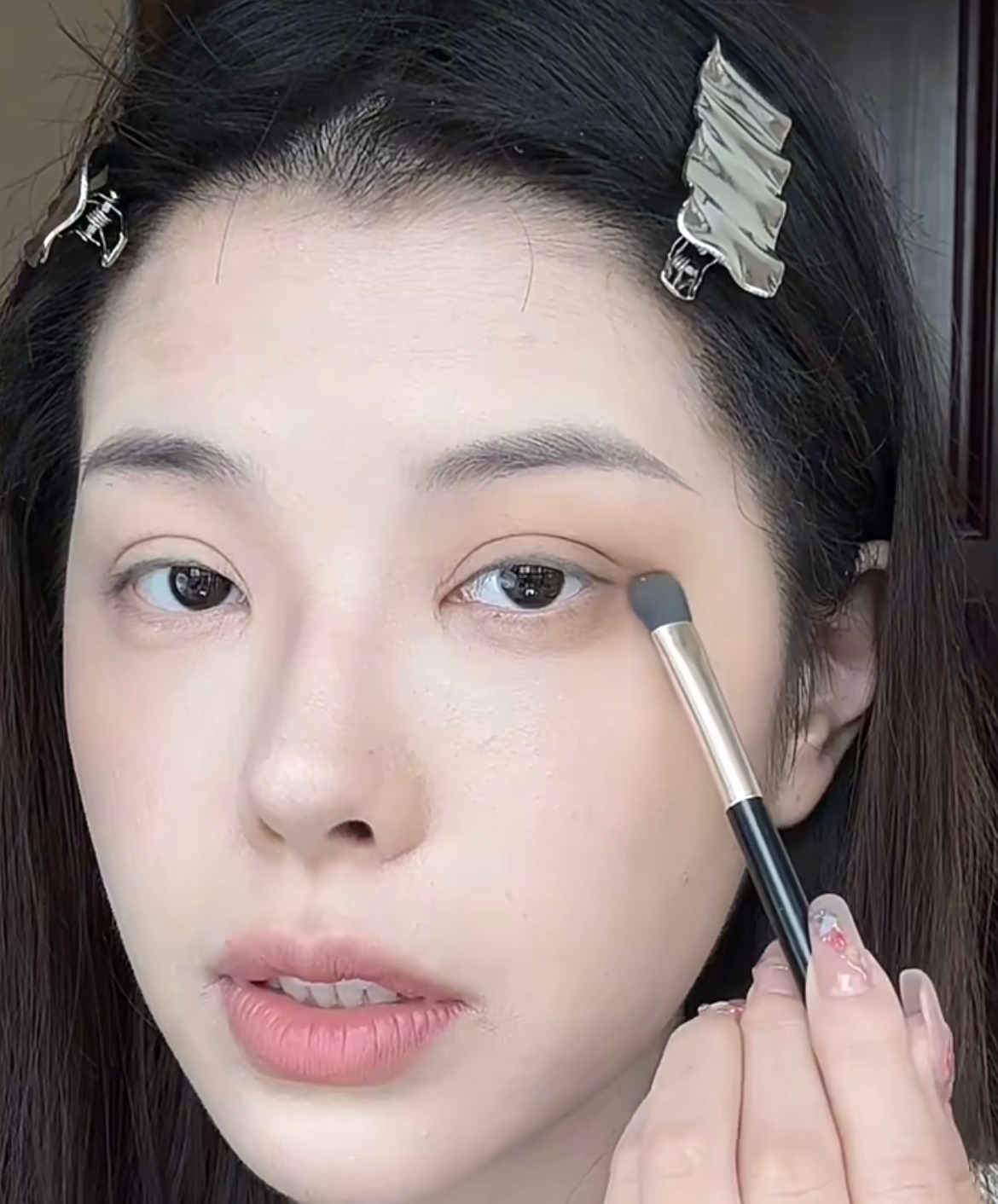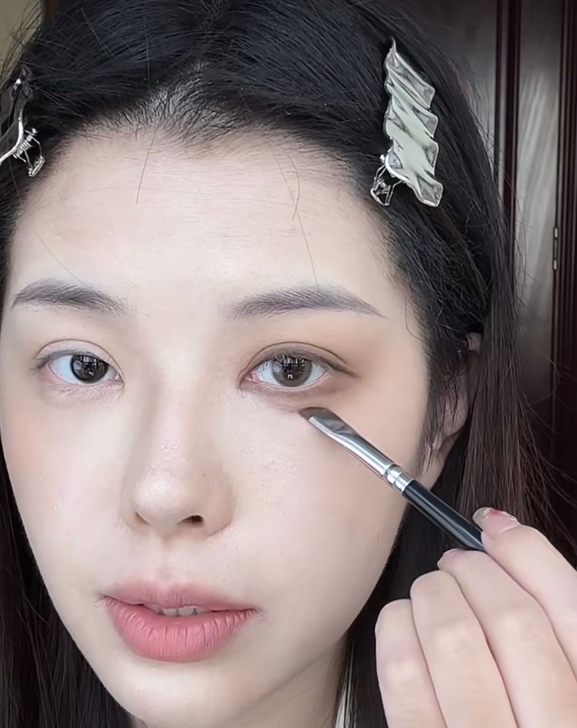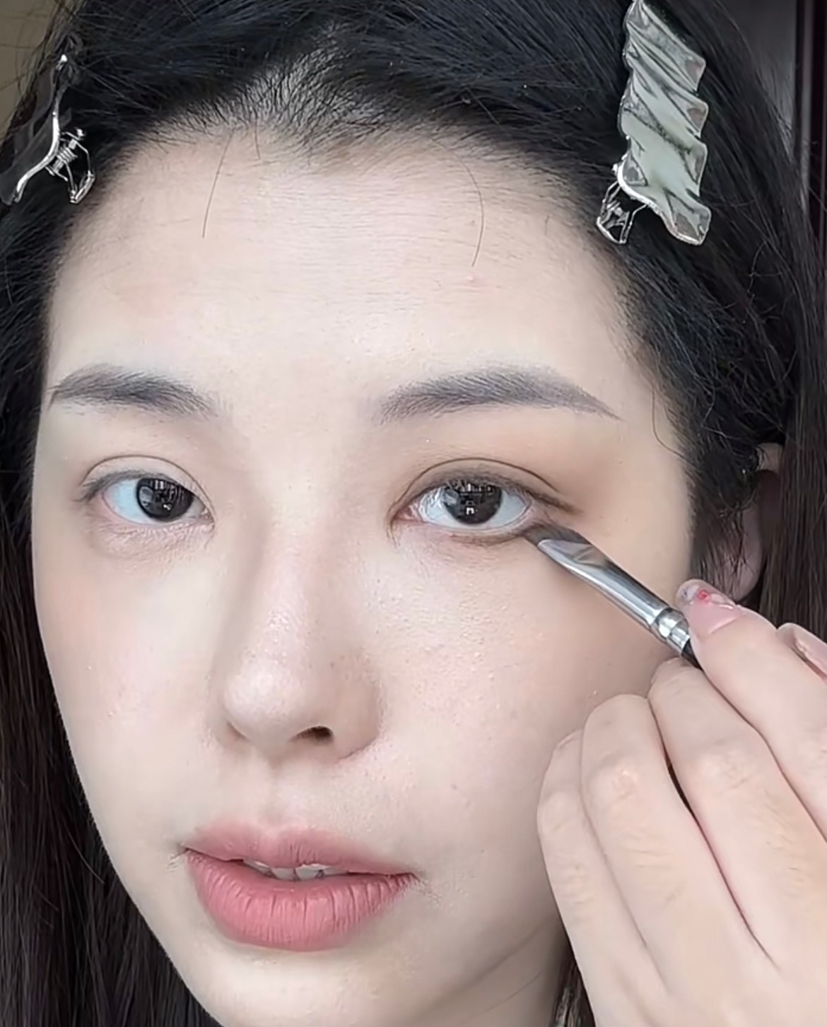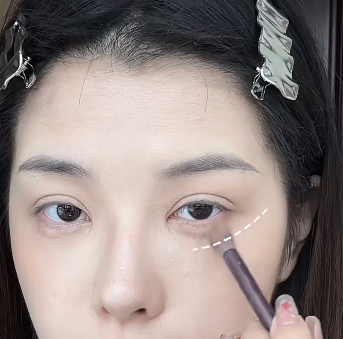 繼續使用深啡色的眼影在眼珠正下方睫毛根部的位置,向外橫向拉出一條平行的線,不要連到眼尾,餘粉再往眼頭掃一掃,再把剩餘的餘粉用來畫臥蠶。