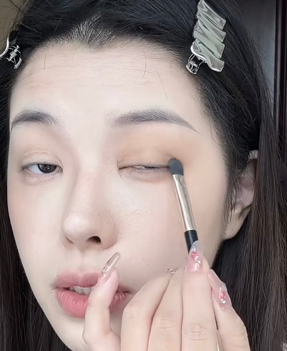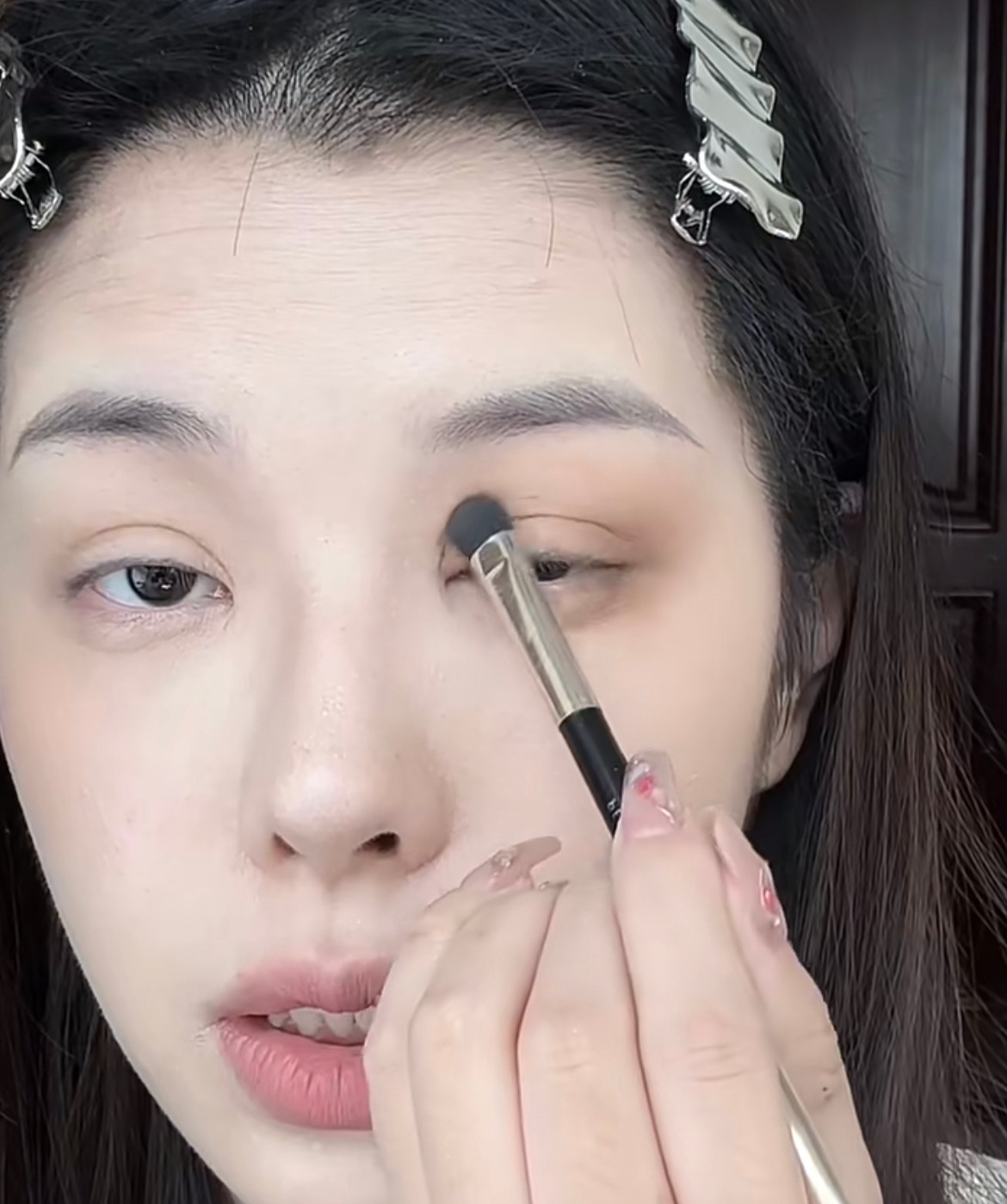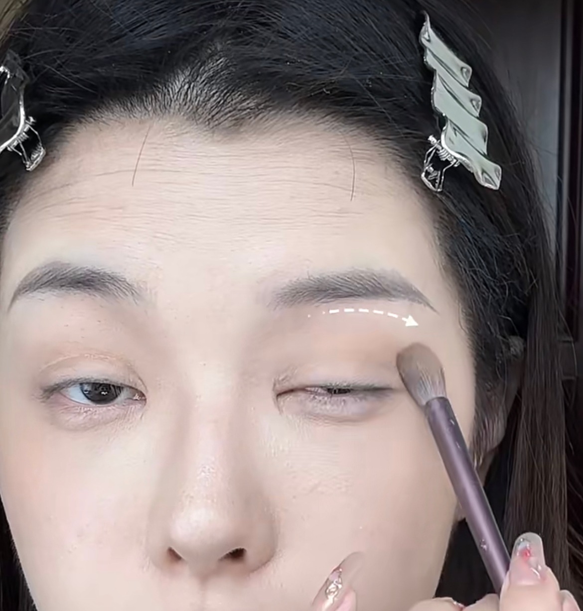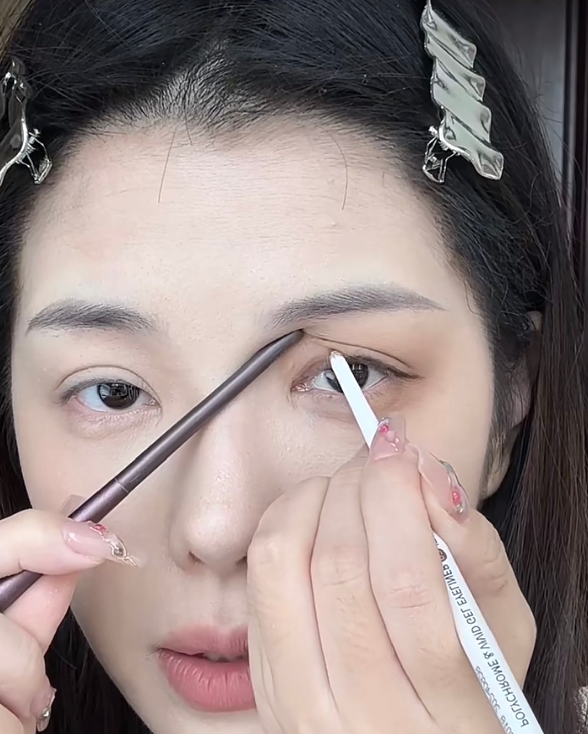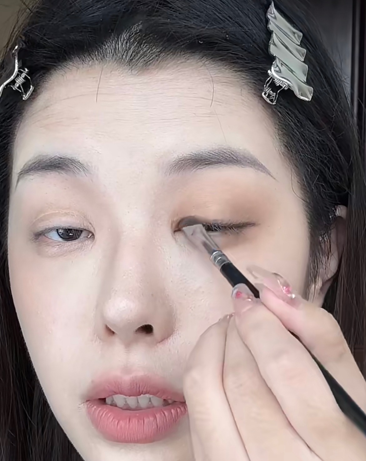 選擇比剛剛深一個色號的眼影。如果是長眼的女生,可以掃在眼球上方,幫助調整眼高,那如果是短眼的女生,則掃在眼尾上下做加深,可以延長眼型。而眼頭較尖的也可以再掃在眼頭位置,令它看起來更圓。
