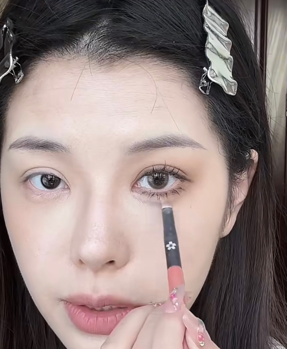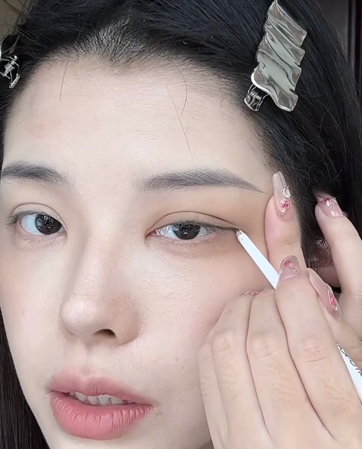 之後再使用淺色眼線筆畫出眼線,再提亮臥蠶和痴上眼睫毛就完成眼妝了!